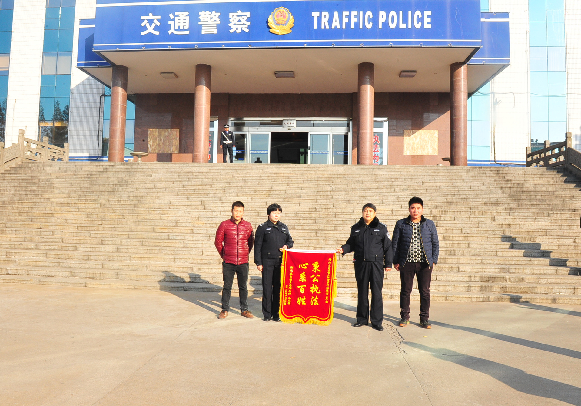 12月11日上午,临沂市郯城县泉源乡后班庄村村民蔡欣旺携亲属将一面写有“秉公执法 心系百姓”的锦旗送到河东交警手中,表达交警对工作兢兢业业,不辞辛劳,全力以赴为民破案的感激之情。